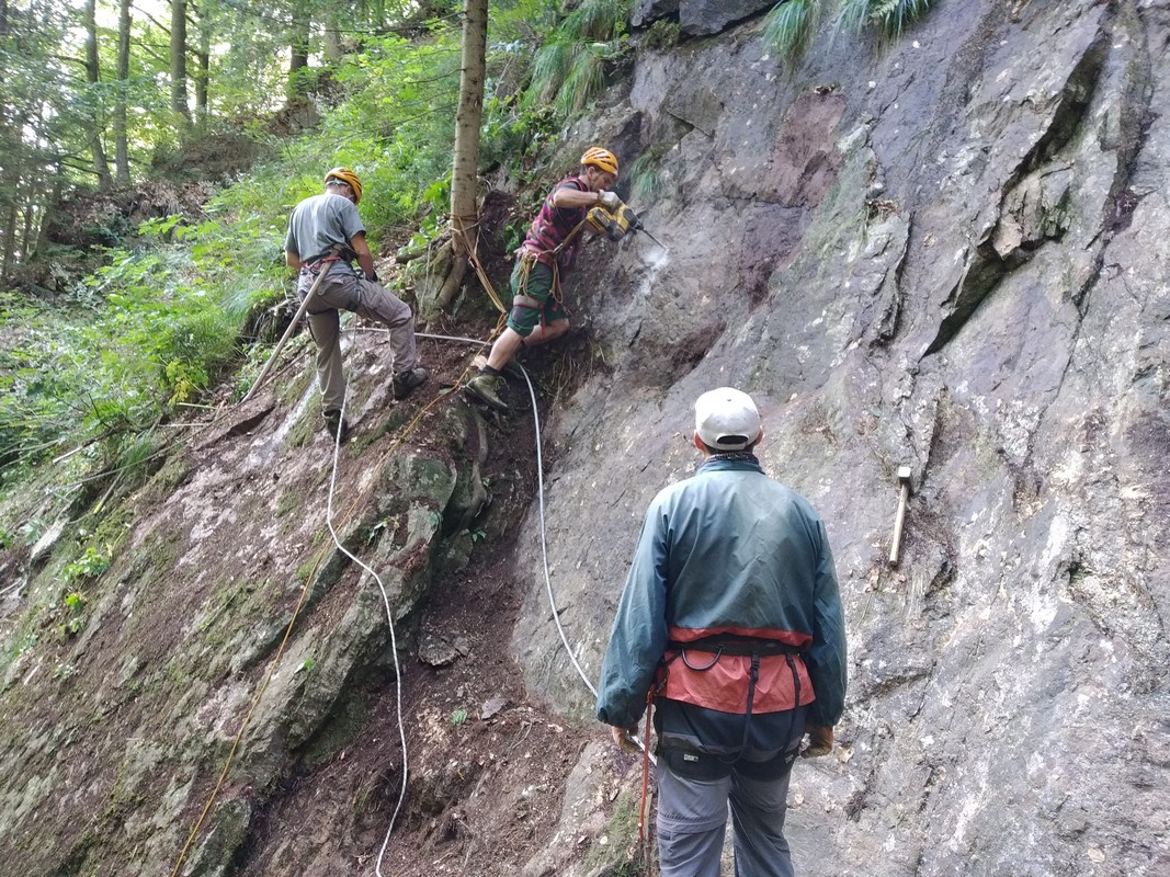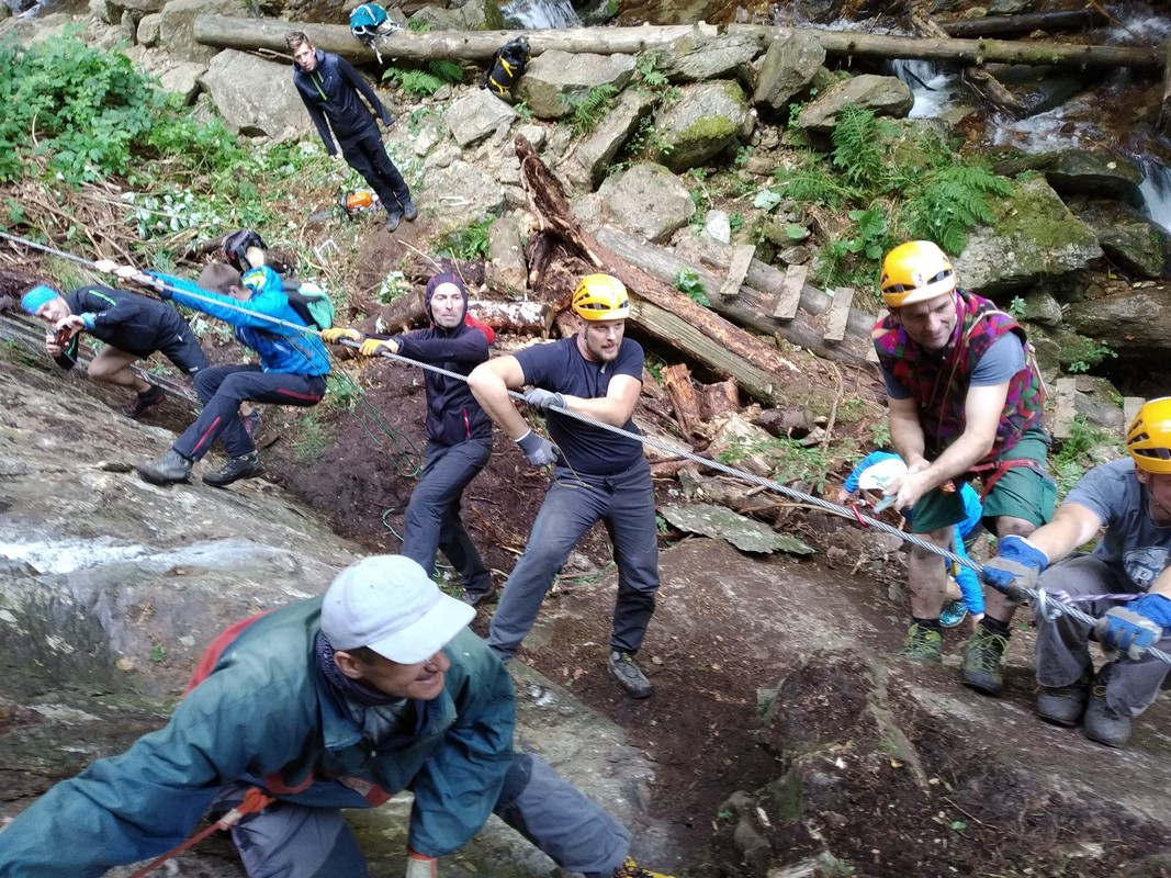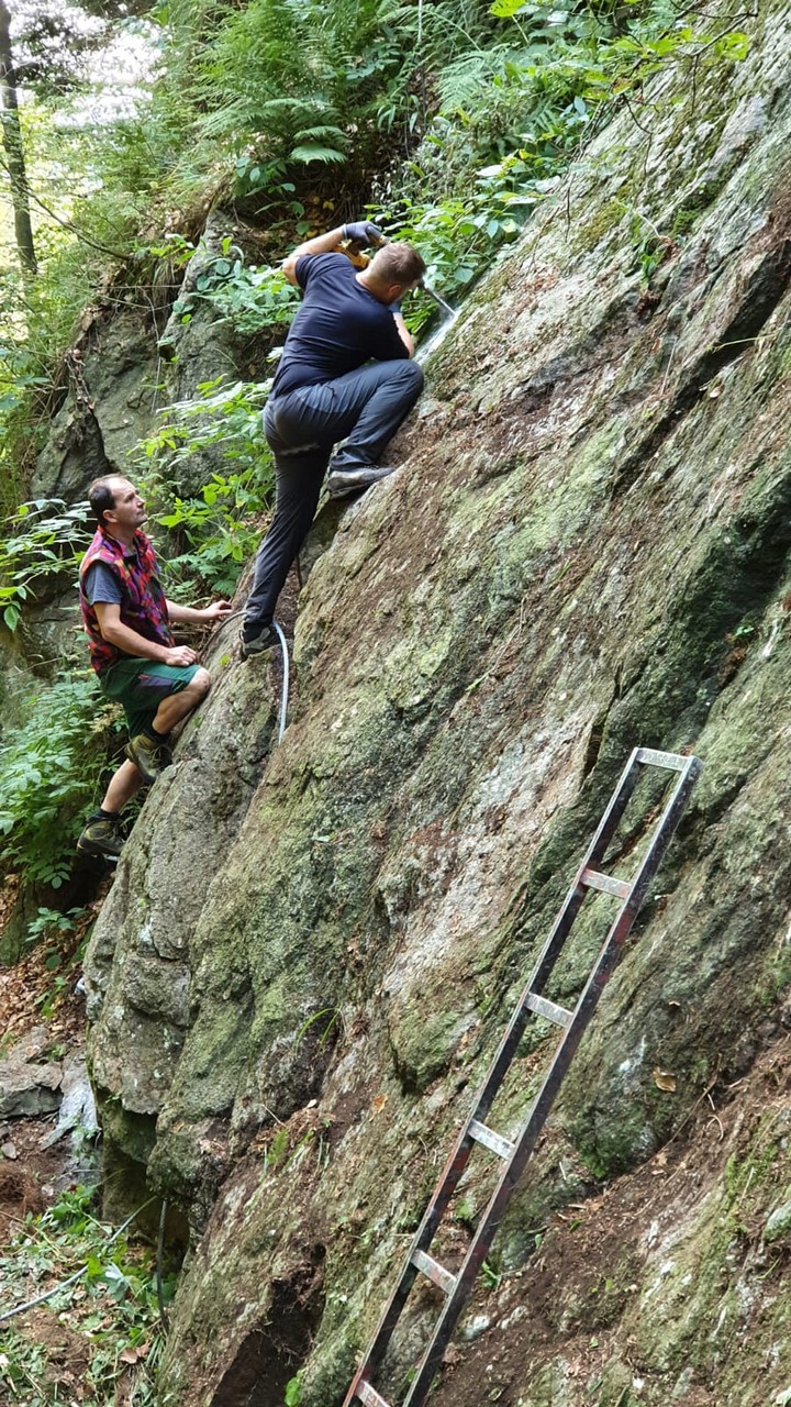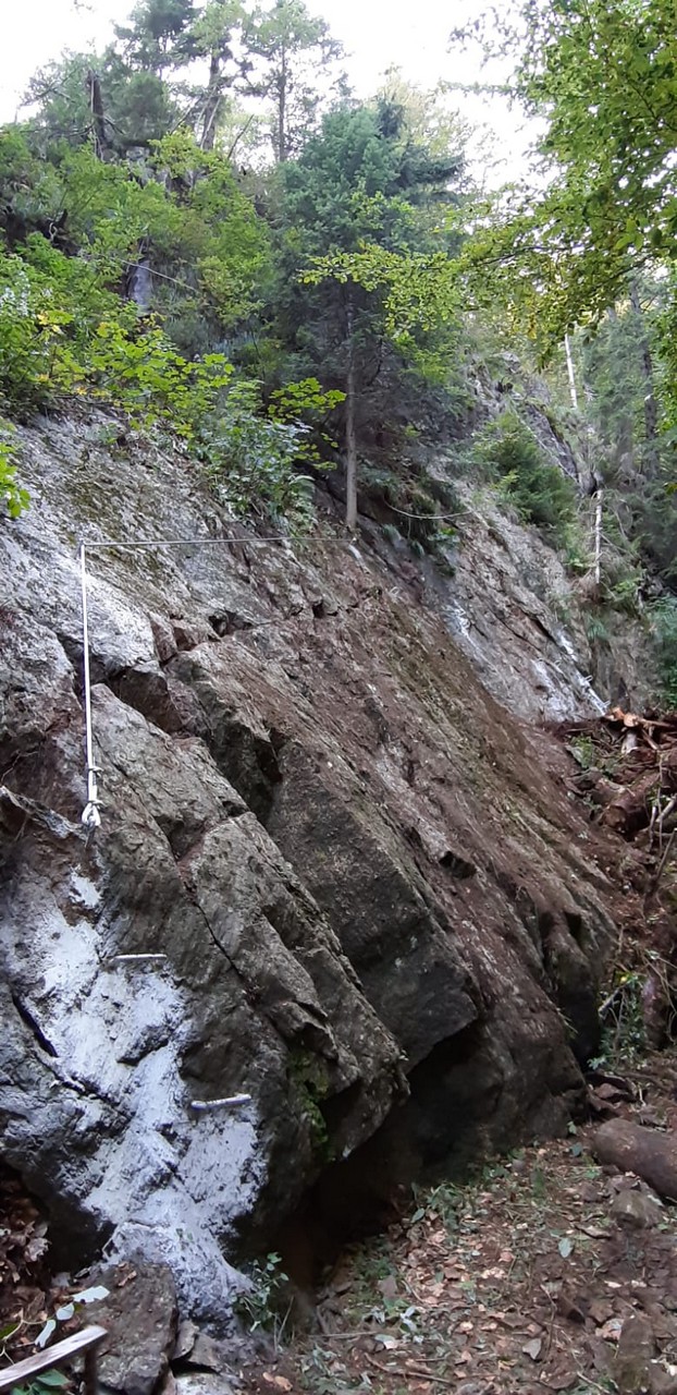 Najviac práce si vyžiadal sektor okolo prehnitého mostíka vo vrchnom úseku, kde bola výstupová trasa preložená z koryta potoka na skalnú platňu. Tú však bolo najprv treba vyčistiť od nánosov hliny, voľných kameňov a rastlín. Následne boli osadené lepené kotvy, stupačky a natiahnuté fixné lano.