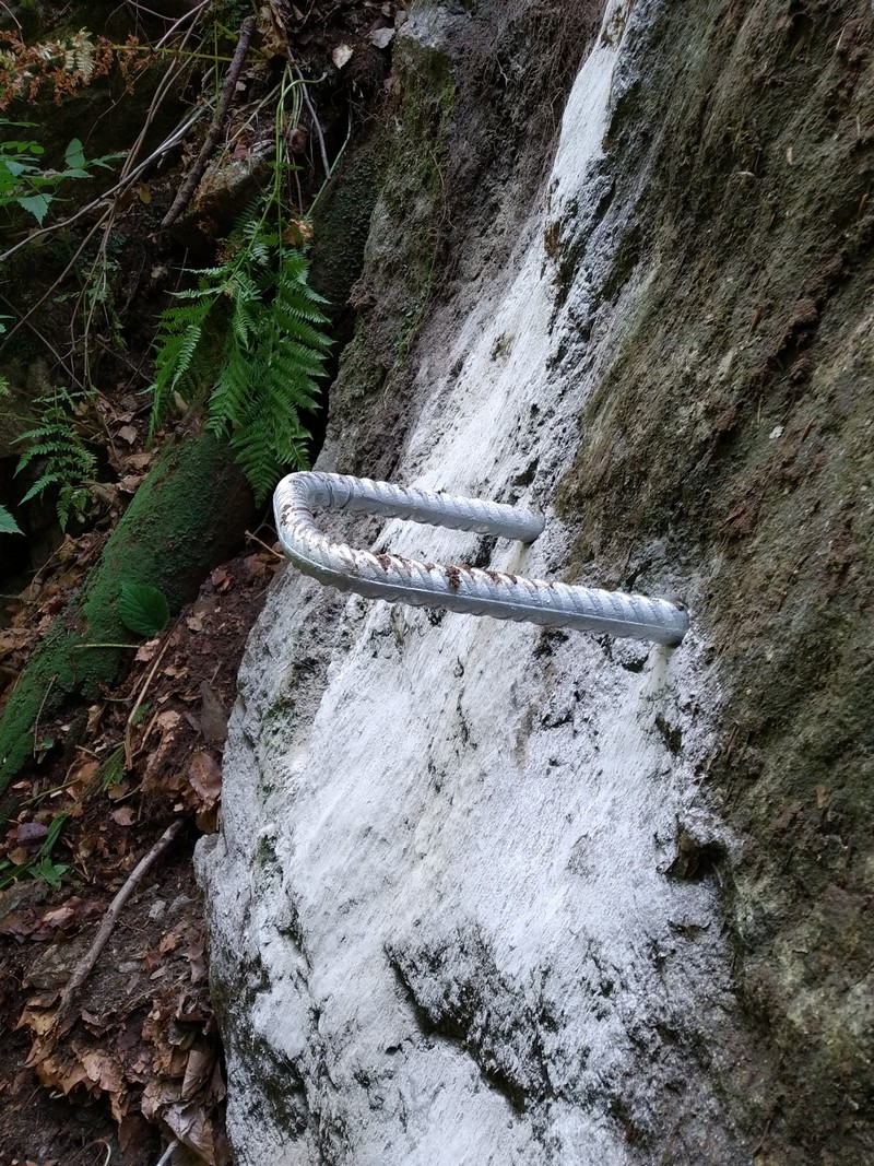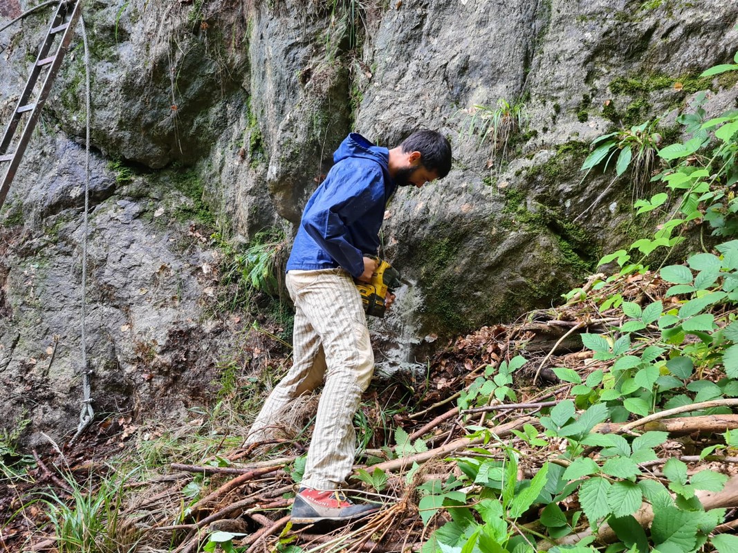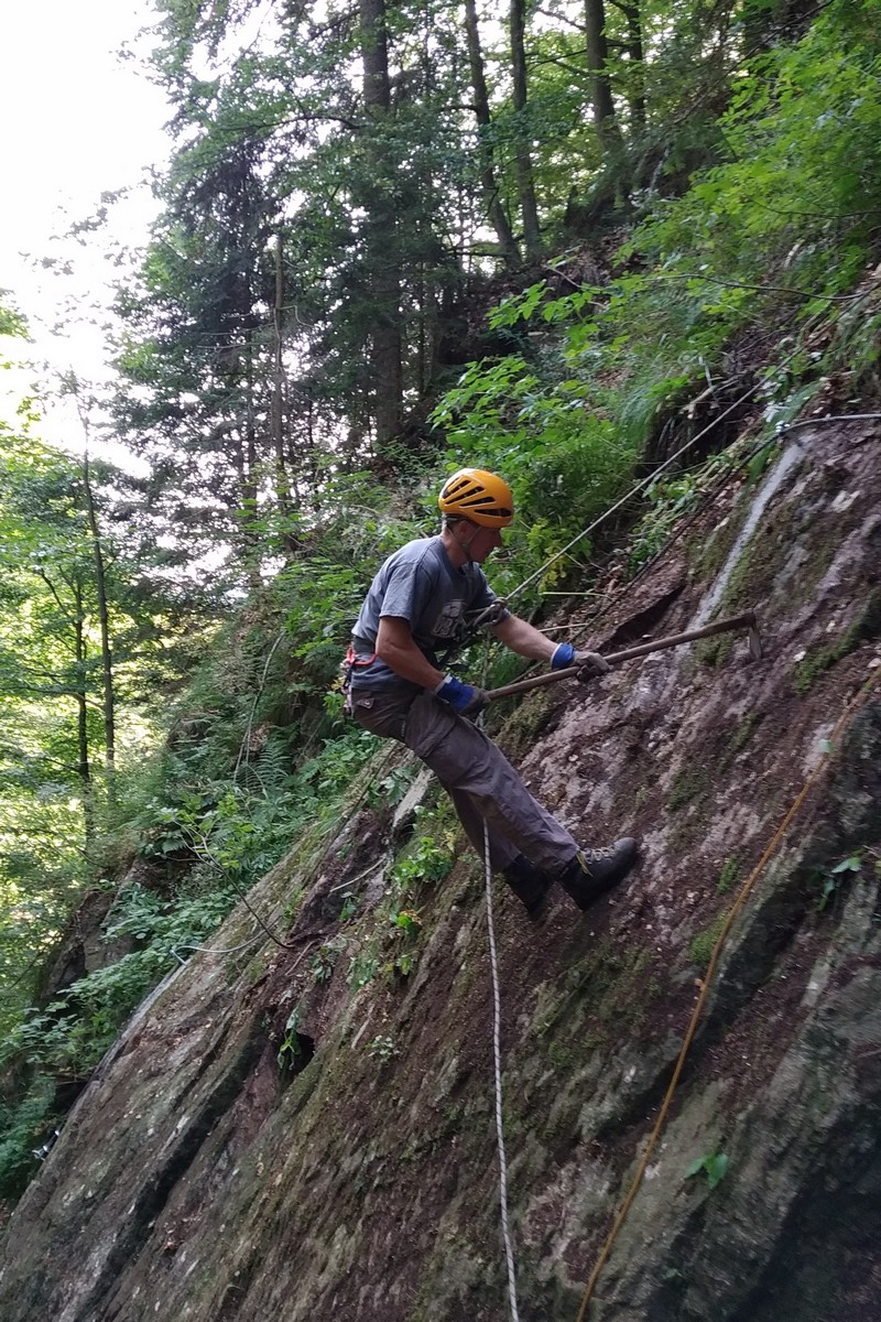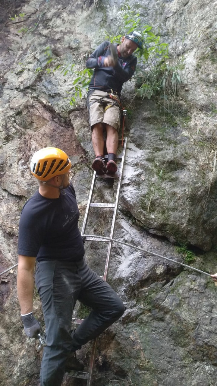 Najviac práce si vyžiadal sektor okolo prehnitého mostíka vo vrchnom úseku, kde bola výstupová trasa preložená z koryta potoka na skalnú platňu. Tú však bolo najprv treba vyčistiť od nánosov hliny, voľných kameňov a rastlín. Následne boli osadené lepené kotvy, stupačky a natiahnuté fixné lano.